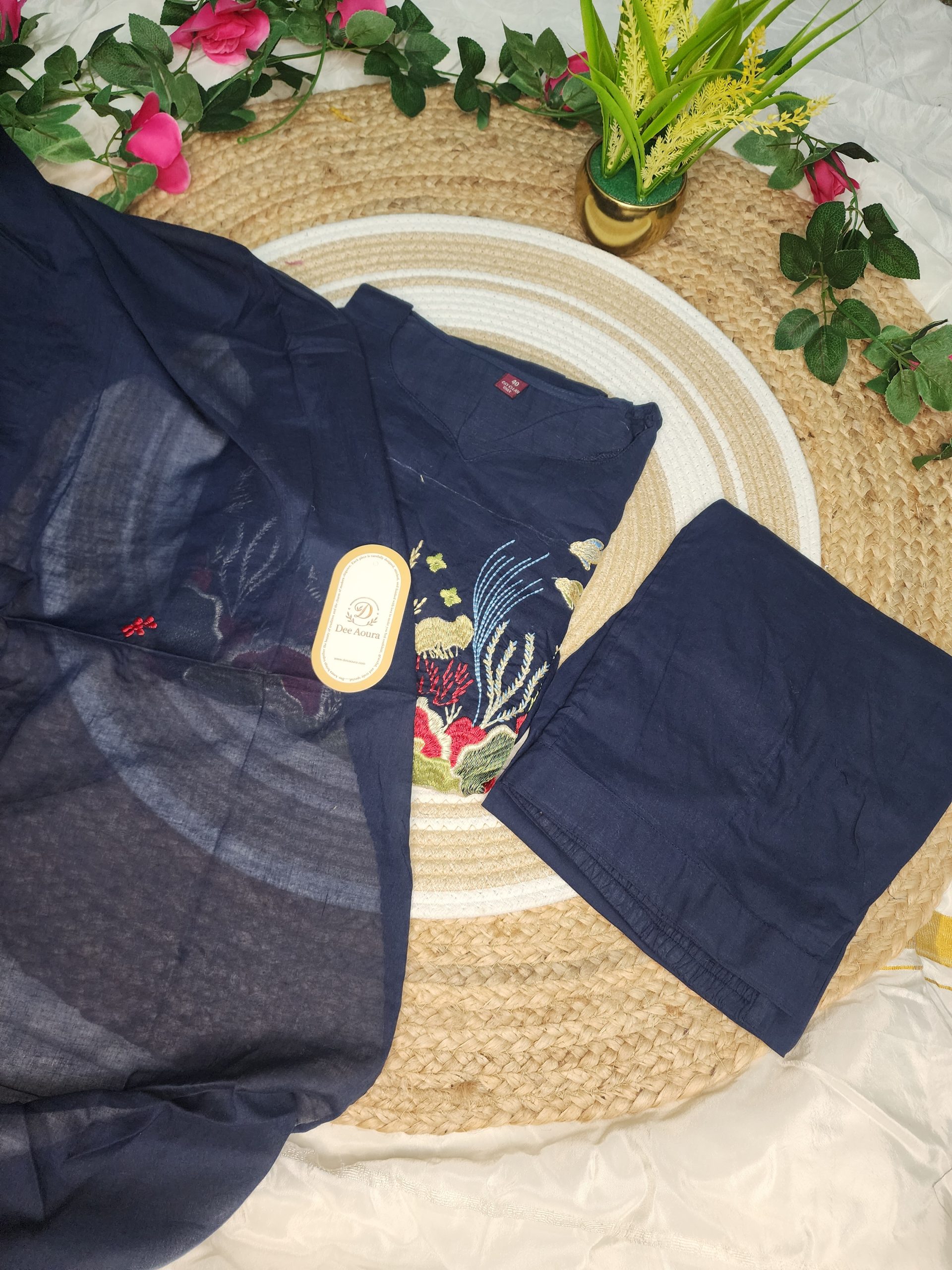 Aakriti – Navy Blue Mul Cotton Thread-Embroidered Salwar Suit