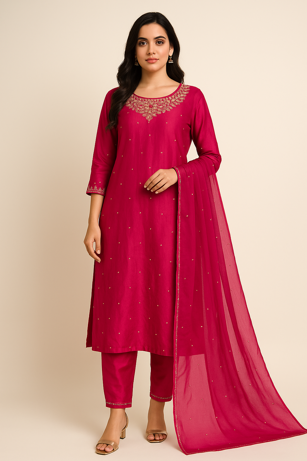 From the house of Dee Aoura, Raashi is a magenta Chinon silk salwar suit crafted for weddings and parties. Embellished with golden motifs and intricate embroidery, it’s paired with tailored pants and a designer dupatta—an ensemble that radiates festive elegance.