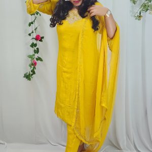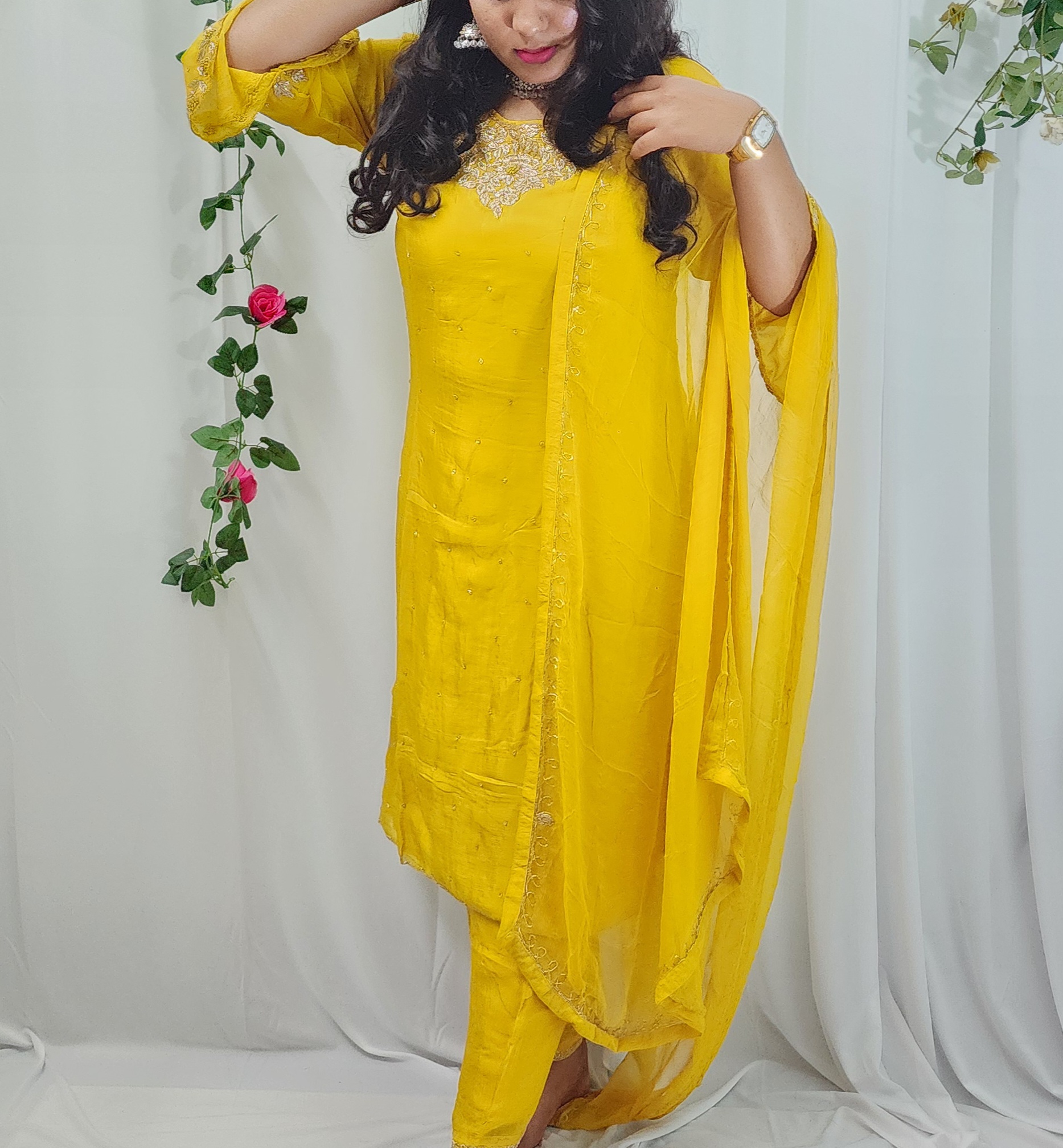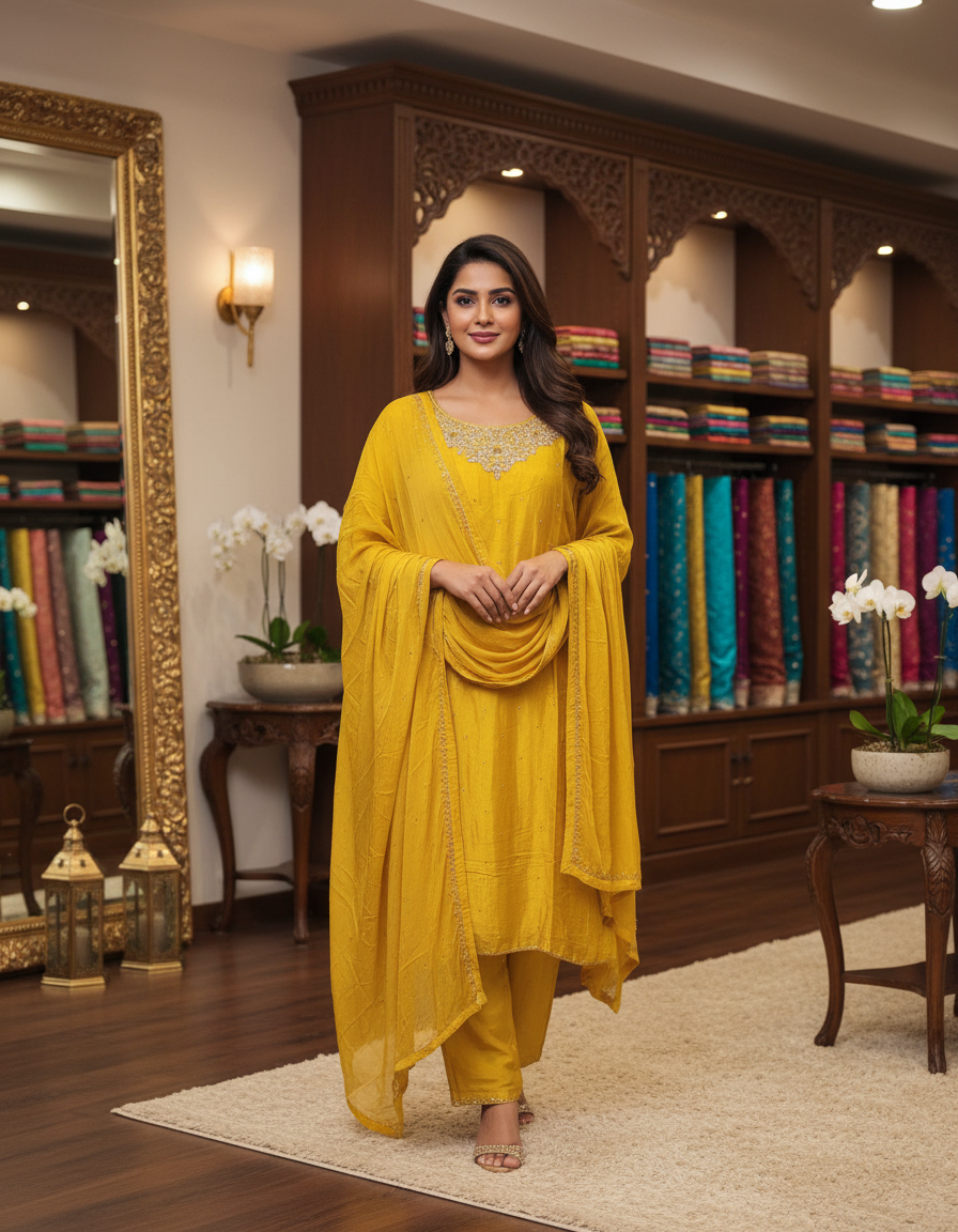 This radiant mustard ensemble embodies luxury with its delicately embroidered neckline, shimmering thread and sequin work, and flowy dupatta that moves like liquid gold.