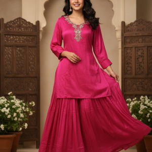Zara Bloom is a premium co-ord set in cream crepe silk, featuring vibrant floral motifs in red, orange, and blue. The long tunic is detailed with black geometric borders and paired with wide-legged palazzo pants for fluid movement. Ideal for festive brunches, cultural gatherings, or elevated daywear.